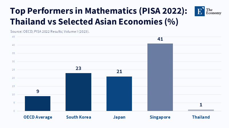 The fact that only 1% of Thai students achieved the highest proficiency levels in international mathematics testing in the PISA 2022 assessment should bring any discussion about educational changes to an immediate halt. This statistic reveals that top-tier academic excellence is extremely uncommon. In addition, it shows a basic problem: Thailand's educational system is split into two paths. One path aims to produce a small number of globally competitive individuals, while the other seeks to ensure that the majority of the population possesses basic literacy, numeracy, and job-related skills. This division has a considerable effect on prospects in life, family choices, and economic Expansion in Thailand. If top-tier training is not supported by sufficient opportunities in the domestic job market, graduates may seek employment abroad or find themselves unemployed. The economy's average productivity cannot grow if basic education is inadequate. Thailand must implement two well-coordinated educational routes: high-quality foundational education for the majority and precisely designed pathways for the elite, all of which must be aligned with actual employment demands, according to this analysis.