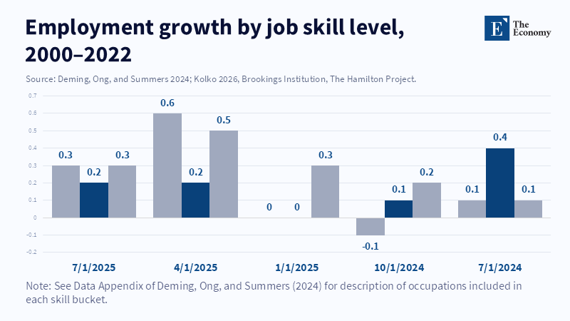 This distortion also appears when looking at skill levels. Figure 2 tracks job growth by skill categories since the 1980s. From 2016 to 2022, high-skill jobs increased by 4.3 percent, while low-skill jobs declined by 2.1 percent. Optimists point to the rebound after a plateau from 2010 to 2016 as evidence that workers can learn new skills. Yet the mix of tasks has shifted. Research by Deming, Ong, and Summers (2024) shows that most of the high-skill gains come from new “interface” jobs, such as UX researchers, prompt engineers, and AI policy analysts—roles that mediate between humans and software and barely existed a decade ago. These are growth areas but not reliable safety nets. If the broader category of full-stack knowledge work becomes automatable, these interface roles may shrink instead of grow. Simply tracking headcount does not reveal such cascading risks.