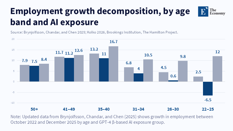 The comfort we take in employment figures comes from their concreteness, but these numbers lag behind reality. Figure 1’s grey bars show overall job growth across all age groups since late 2022. However, if we exclude roles with high GPT-4 exposure, shown as navy bars, a different picture emerges: job growth becomes negative for 22- to 25-year-olds by 6.5 percent and almost flat for 26- to 30-year-olds. Older workers, whose tasks are less reliant on digital coding, still see healthy gains. At first glance, this pattern might seem mild or just part of typical economic cycles. But surveys reveal that firms tend to deploy large language models first in entry-level clerical, marketing, and routine analytical tasks—the very jobs where young people start their careers. What we are seeing is displacement happening quietly, not through firing current employees, but by eliminating early-career job paths. Judging AI’s impact based on total employment is like trying to assess heart health by looking only at skin color.