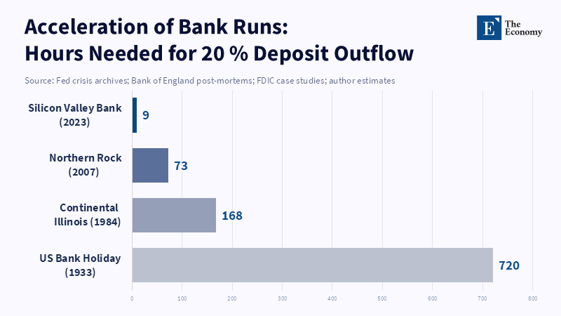 The Silicon Valley Bank collapse offers a harsh lesson in speed. Earlier runs took days, but mobile banking cut this to hours. Instant payment systems and social media shortened decision times. Within 36 hours of the first warning, 85 percent of uninsured deposits were withdrawn or lined up for withdrawal. Regulators guaranteed deposits to stop the crisis, but bond losses had already spread risks widely.