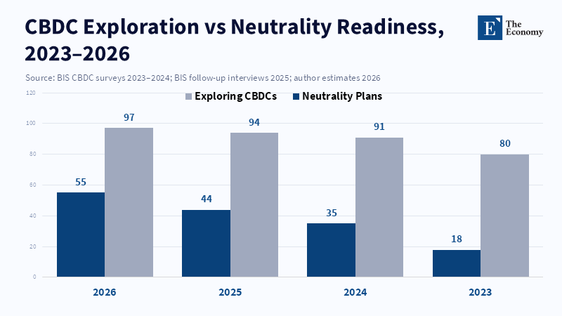 CBDC neutrality isn’t simply a technical detail; it’s central to preserving trust. Each unit of digital currency issued by the central bank may replace an equal amount of bank deposits. This shift doesn’t cause problems if the central bank simultaneously provides liquidity to banks through tools like standing facilities or term funding, on terms comparable to or better than those available in wholesale markets. A 2024 survey of 93 monetary authorities found that 91% were exploring CBDCs. According to a report from the Bank for International Settlements, central banks are progressing with their digital currency initiatives at their own chosen pace, adopting varied strategies and exploring different design options.