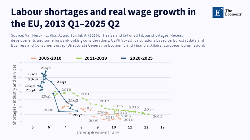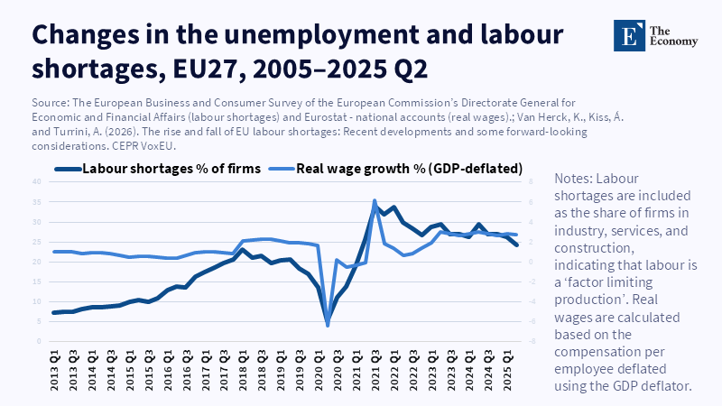 The commonly held assertion claims that labour shortages peaked in 2022 and have since diminished. Although vacancy rates have declined from 2.7% during the 2022 summit period to roughly 2.0% in late 2025, this figure remains above the 1.7% benchmark observed a decade prior. According to a report from the European Labour Authority, there are widespread shortages in several sectors, including construction, as well as in occupations such as welding, nursing, cooking, and electrical work. These sector-specific bottlenecks largely drive wage inflation, project delays, and consequently public dissatisfaction, exhibiting greater influence than aggregate vacancy trends suggest.