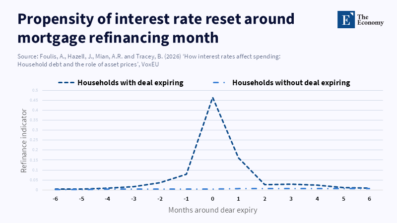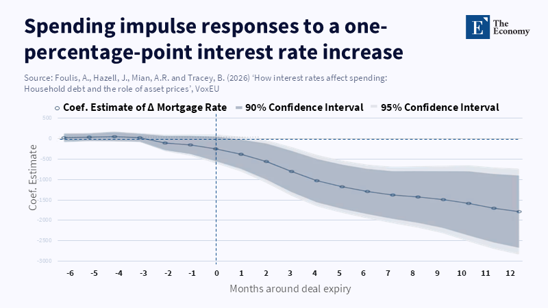 The behavioral repercussions are increasingly observable. According to a recent report from the European Central Bank, discretionary retail card spending has decreased by about 4% year on year during periods when mortgage repricing surges have surpassed the average of the previous five years. The analysis shows that roughly one-third of this decline can be attributed to immediate cash-flow pressures, while the remainder is attributable to balance-sheet effects as homeowners cut back on borrowing. against home equity that has diminished in perceived affordability. This implies that shifts in asset-price expectations, rather than changes in interest payments alone, predominantly influence consumption dynamics.