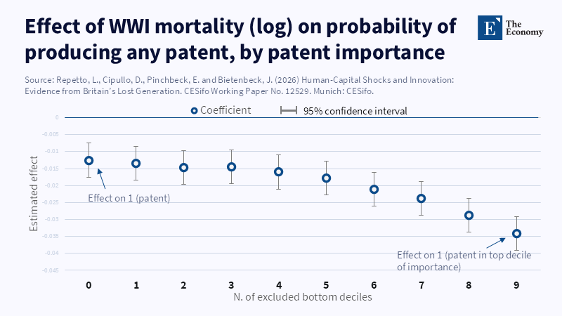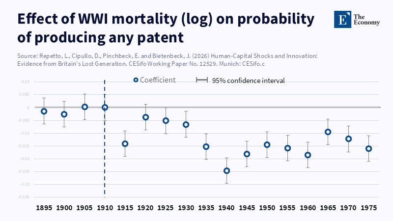 The usual story about Britain after the First World War stresses grief, debt, social change, and a difficult peace. All of that matters. But the sharper policy point is that war did not simply subtract workers from the labor force. It removed a concentrated slice of young male human capital at the very moment when modern industry depended more heavily on technical knowledge, formal training, and local networks of invention. New research linking parish-level military deaths to patent records across Britain shows that places hit harder by wartime mortality produced fewer patents for decades after the war. The effect was not trivial. The referenced study examined infant and early-childhood mortality rates in British parishes during the early 1800s, exploring how higher death rates were associated with community outcomes such as innovation. It means war not only reduced the volume of innovation. It reduced its frontier edge.