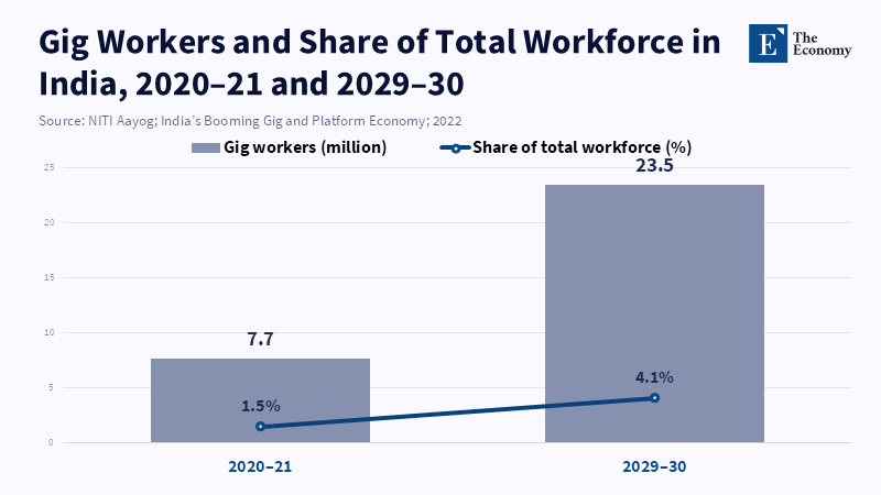 The recent course of action taken by India is important because it reframes the debate. Over many years, Indian policymaking has concluded that the focus should be on forcing platform workers into employee status. It is now establishing a welfare delivery route for workers who work outside the complete employer-employee framework. The NITI Aayog, the government think tank, can estimate that 7.7 million Indians within the gig economy existed in 2020,21, but envisioned this could grow to more than 23.5 million in 2029,30, a jump from 1.5%of the country’s workers to 4.1%. Likewise, the Ministry of Labor announced in 2025 that the 2024,25 gig economy would
