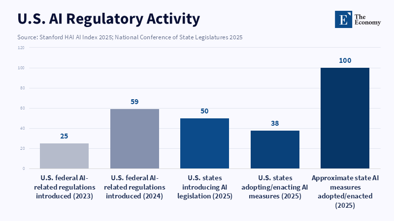 The argument that far-off uncertainty is the biggest obstacle to AI innovation sounds logical, but it's incorrect in today's environment. The US government, while fighting for deregulation with the 2025 Trump mandate to fortify American AI access, faces a more complicated legal environment. In 2024, Stanford's 2025 AI Index revealed that US Federal bodies issued 59 regulations on AI, nearly twice as many as in 2023. The pace at the state levels is even more faster, with every state pitching AI legislation in 2025 and 38 states passing close to 100 laws. California’s SB 53, for example, requires frontier AI developers to publish safety frameworks, report critical incidents, and face civil penalties for noncompliance. That's not a dormant market in a haze of unclear legislation; it's a market operating under an expanding rulebook from many sources.