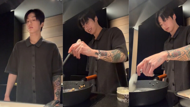 He explained the inspiration came from a recent restaurant visit, and he wanted to recreate the delicious meal himself. Not stopping at pasta, he then made dessertâa perfectly crafted toast with one-handed egg cracking and soft scrambled eggs, accompanied by butter and strawberry jam, all while engaging in warm, casual banter with the thousands of ARMYs watching.