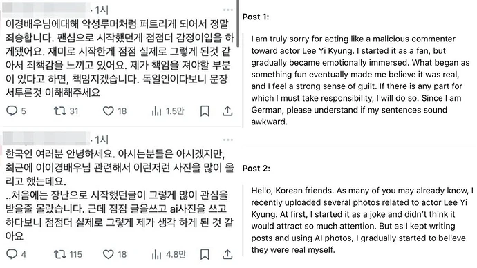 “I didn’t know that a post which started as a joke would receive so much attention. But as I kept writing and using AI photos, I started to believe in it myself. I sincerely apologize for spreading malicious rumors about actor Lee Yi Kyung.”