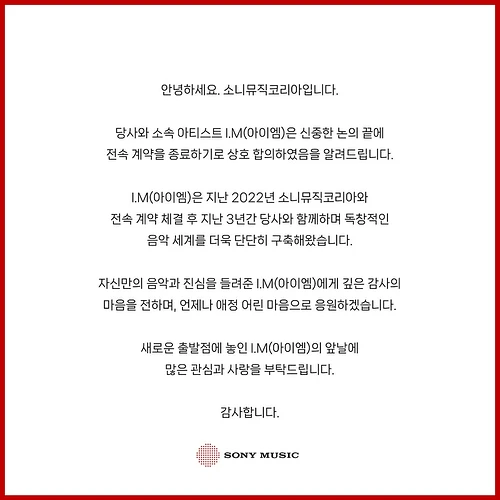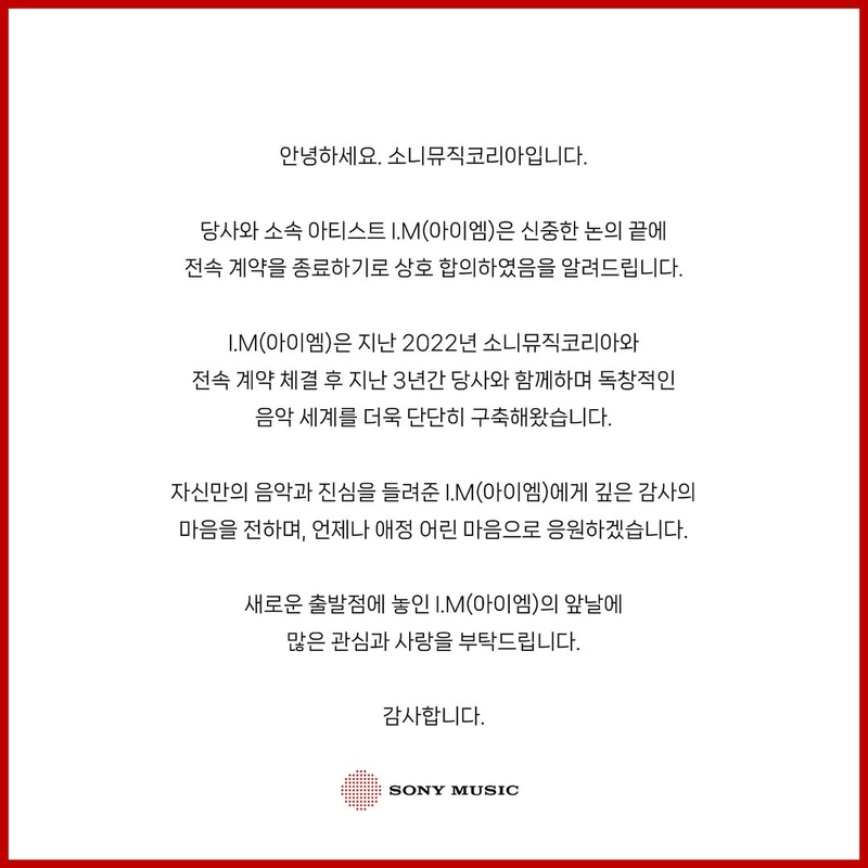 Source: SONY Music via Soompi"Since signing with us in 2022, I.M has spent the past three years building a stronger and more distinctive musical identity together with our company. We sincerely thank I.M for sharing his music and sincerity with us, and we will continue to support him with affection and respect," Sony Music Korea expressed their gratitude, quoted from Soompi.