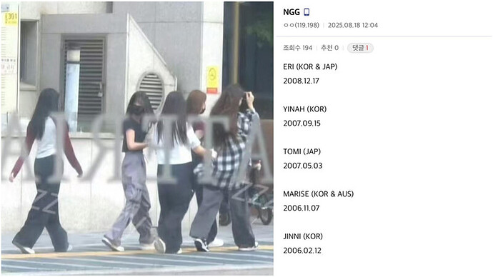 According to circulating rumors, the five trainees allegedly set to debut under NGG are Eri, Yinah, Tomi, Marise, and Jinni. In a leaked list shared by fans, Eri is described as a Korean–Japanese trainee born on December 17, 2008, while Yinah is a Korean trainee born on September 15, 2007. Tomi is said to be from Japan, born May 3, 2007, whereas Marise is noted as a Korean–Australian trainee born November 7, 2006. Lastly, Jinni is listed as a Korean trainee born February 12, 2006. These names and birthdates remain speculative, as JYP Entertainment has not released any official statement. The leak is believed to have originated from a Korean community site where a photo of the five trainees walking together was posted—this image then spread across social media, fueling speculation that they are the prospective members of the new girl group (see image below).