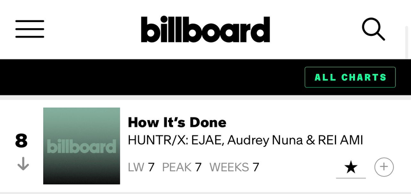 Billboard ChartsAs the opening anthem of K-Pop Demon Hunters, “How It’s Done” bursts with bold energy, perfectly capturing the fierce identity of Huntr/x. The track debuted at No. 8 on the Global 200 and No. 19 on the Billboard Hot 100, proving its strong international reception. With a power-packed dance routine, the #HowItsDone challenge spread rapidly, embraced by K-pop trainees, influencers, and global creators alike. On platforms like Reddit, many users commented that “How It’s Done” could easily pass as a real debut track for an actual idol group—further evidence that this soundtrack rivals top-tier K-pop releases.